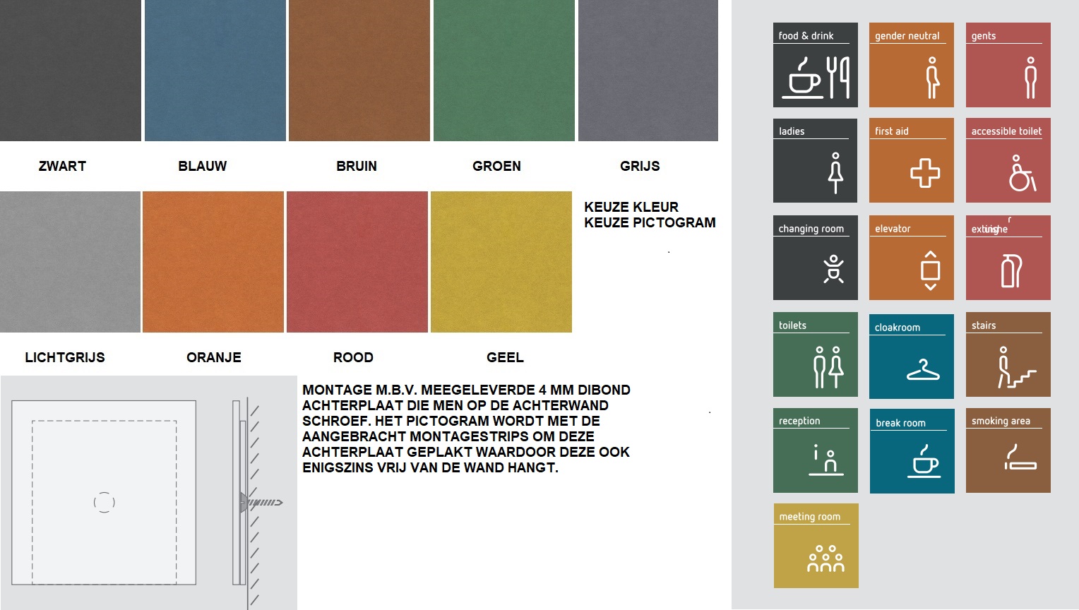 Het pictogram bordje WOOD milieu is een 5 mm dik geperste houten (FSC) paneel in brandklasse B1, die zijn ingekleurd met organische kleurpigmenten en voorzien van het pictogram die u kiest (zie afbeeldingen). Deze hebben een zijdezacht oppervlak en zijn volledig egaal gekleurd. Dit resulteert altijd in een gekleurde zijkant. Zie voor de montage ook de afbeeldingen. Er zijn in totaal 16 pictogrammen in 9 kleuren om uit te kiezen. Door poeder- of verfcoating bewust te vermijden, kunnen we extra CO2-uitstoot bij de productie van WOOD milieu voorkomen. Zie voor de beschikbare pictogrammen en kleuren bijgaande afbeelding en vermeld bij uw bestelling duidelijk uw keuzes.